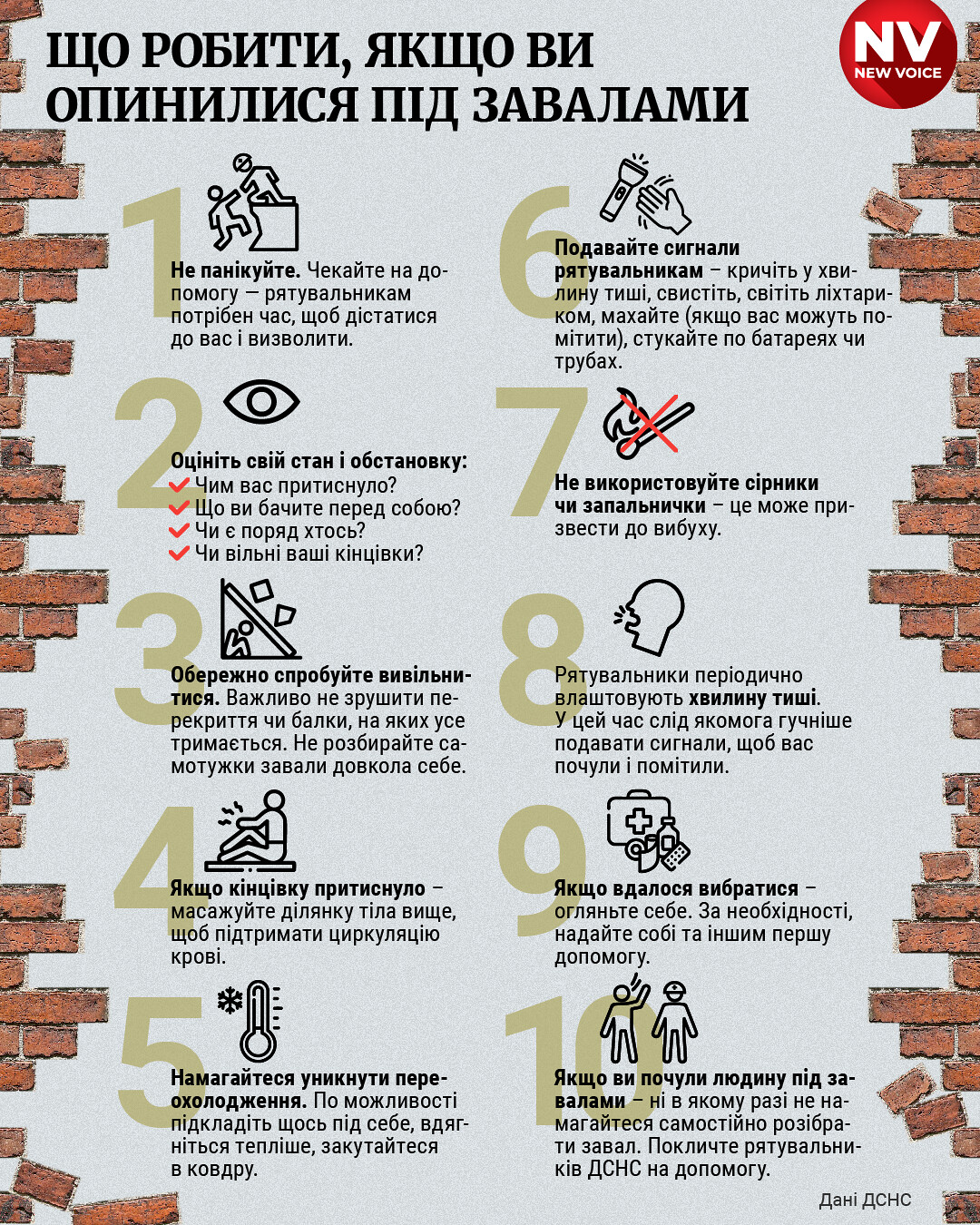 "Зателефонуйте до служби порятунку за номером 101, повідомте про місцезнаходження, кількість людей під завалом та обставини, як це трапилося. Якщо є можливіть, то спробуйте подати сигнали їм, кричіть, стукайте по конструкціях, щоб вас почули.