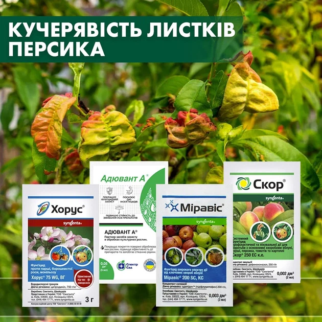 Препарати від кучерявості листя персика: · мідьвмісний препарат, наприклад, Блу Бордо · Фунгіцид Блу Бордо 50 г, Solabiol · Хорус · Фунгіцид Хорус 3 гр, Syngenta …