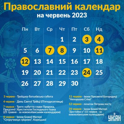 Найбільше з них — День Святої Трійці (П'ятидесятниця), що цього року припадає на неділю, 8 червня. Після неї йде День Святого Духа — 9 червня, а Петрів піст почнеться 16 червня. Також у церковному календарі є кілька памʼятних дат апостолів і святих.