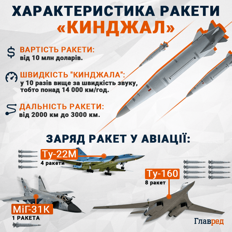 З урахуванням дальності польоту літака в один бік радіус ураження ракети «Кинджал» — приблизно 3000 км. За оцінками Forbes, вартість ракети «Кинджал» може становити до $10 млн і вище. Скільки «Кинджалів» …